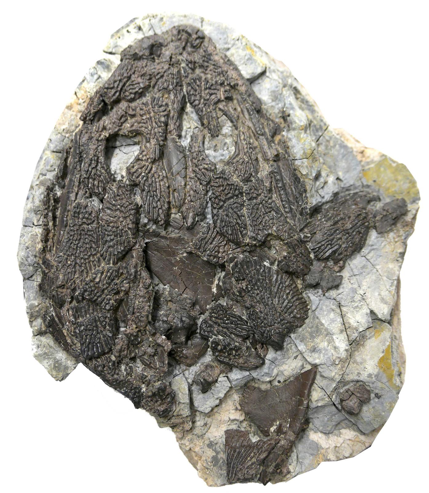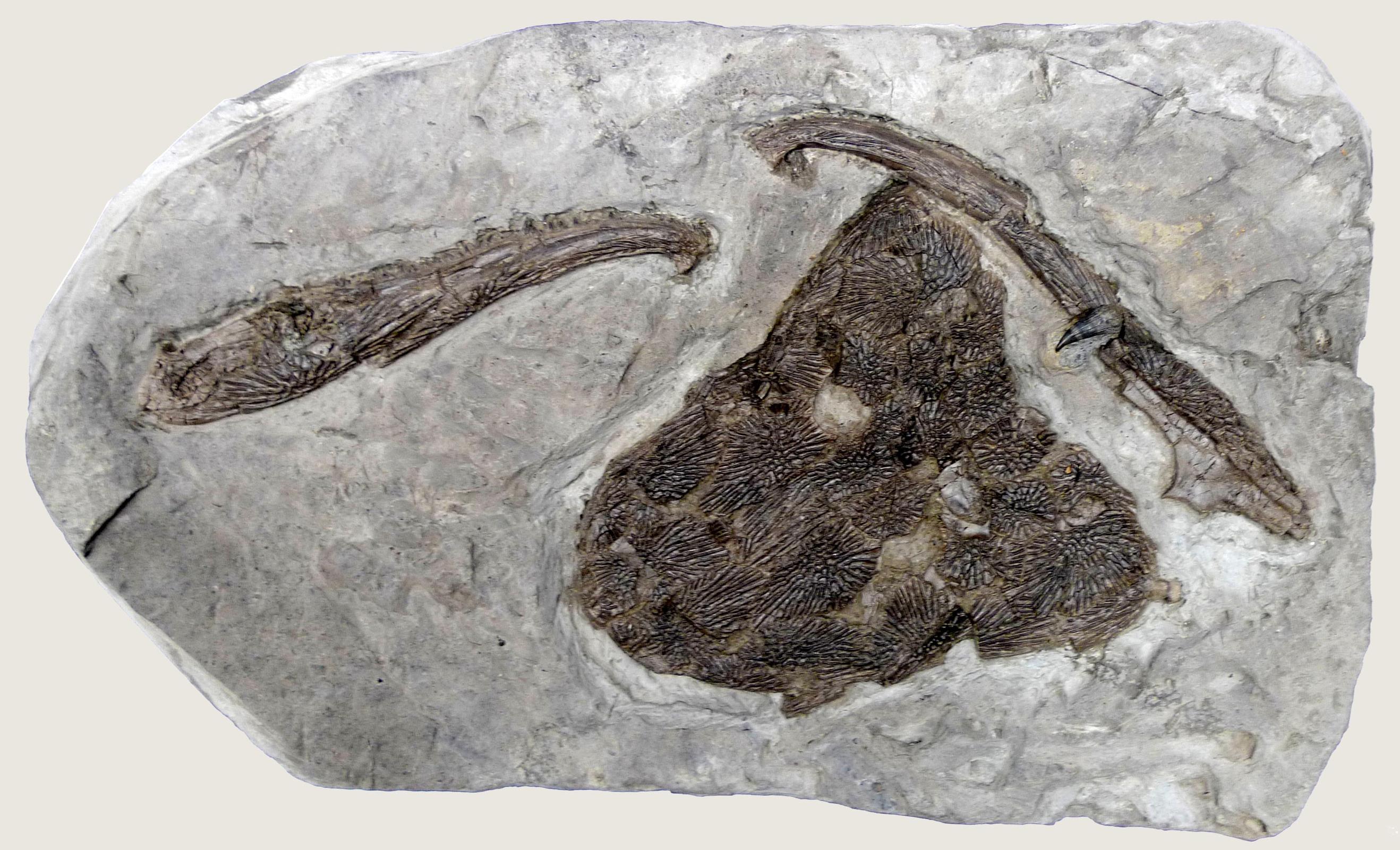 Die beiden seitlichen Claviculae und die zentrale Interclavicula im Schultergürtel des Querkopflurchs Plagiosuchus pustuliferus sind als Panzerplatten mit der arttypischen Knötchenskulptur auf der Außenseite ausgebildet. Anders als der kleinere Plagiosaurier Gerrothorax hat Plagiosuchus keinen Hautpanzer aus Knochenplättchen, sondern kleine Knochenkörner in der Haut eingelagert.