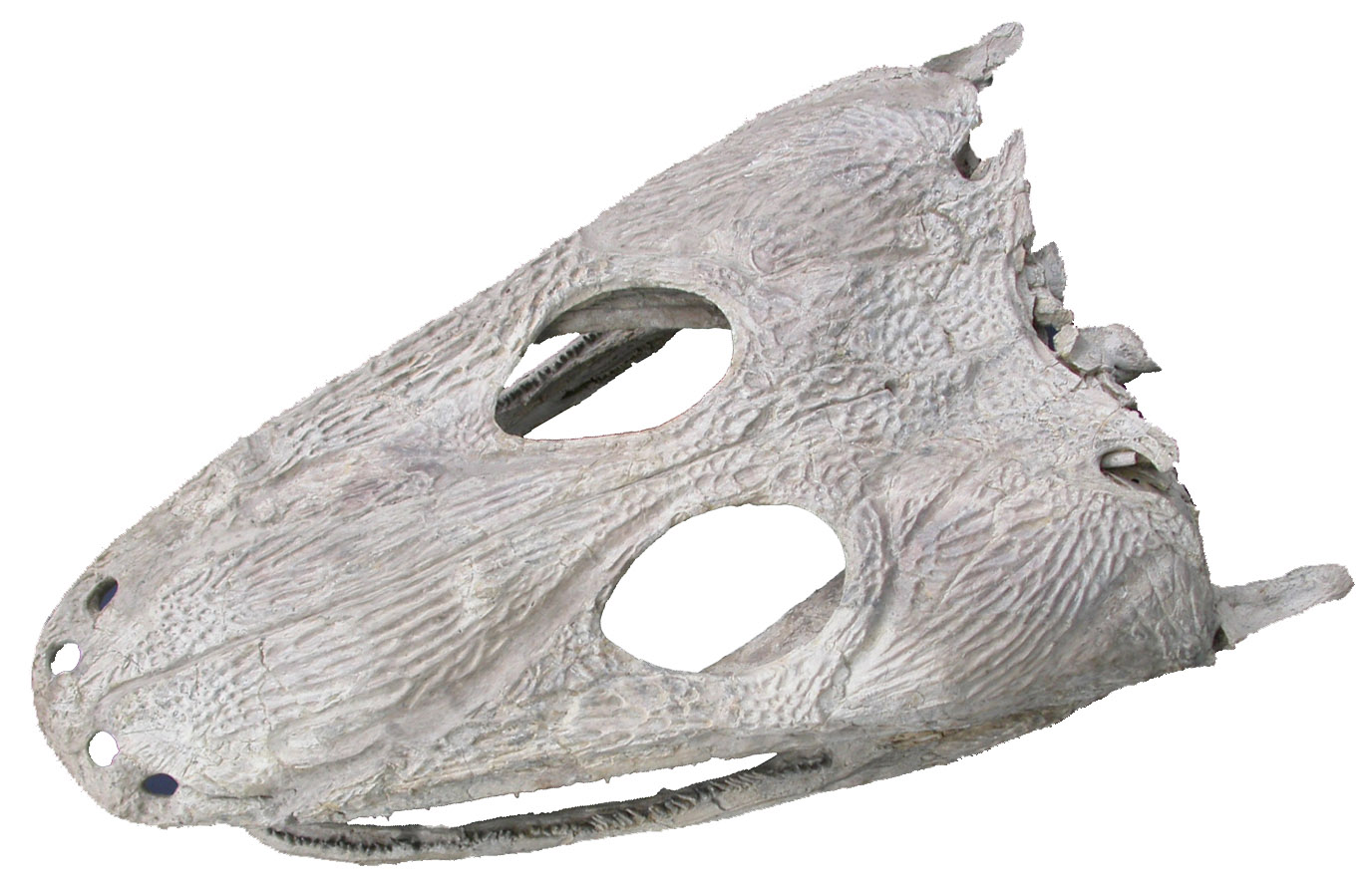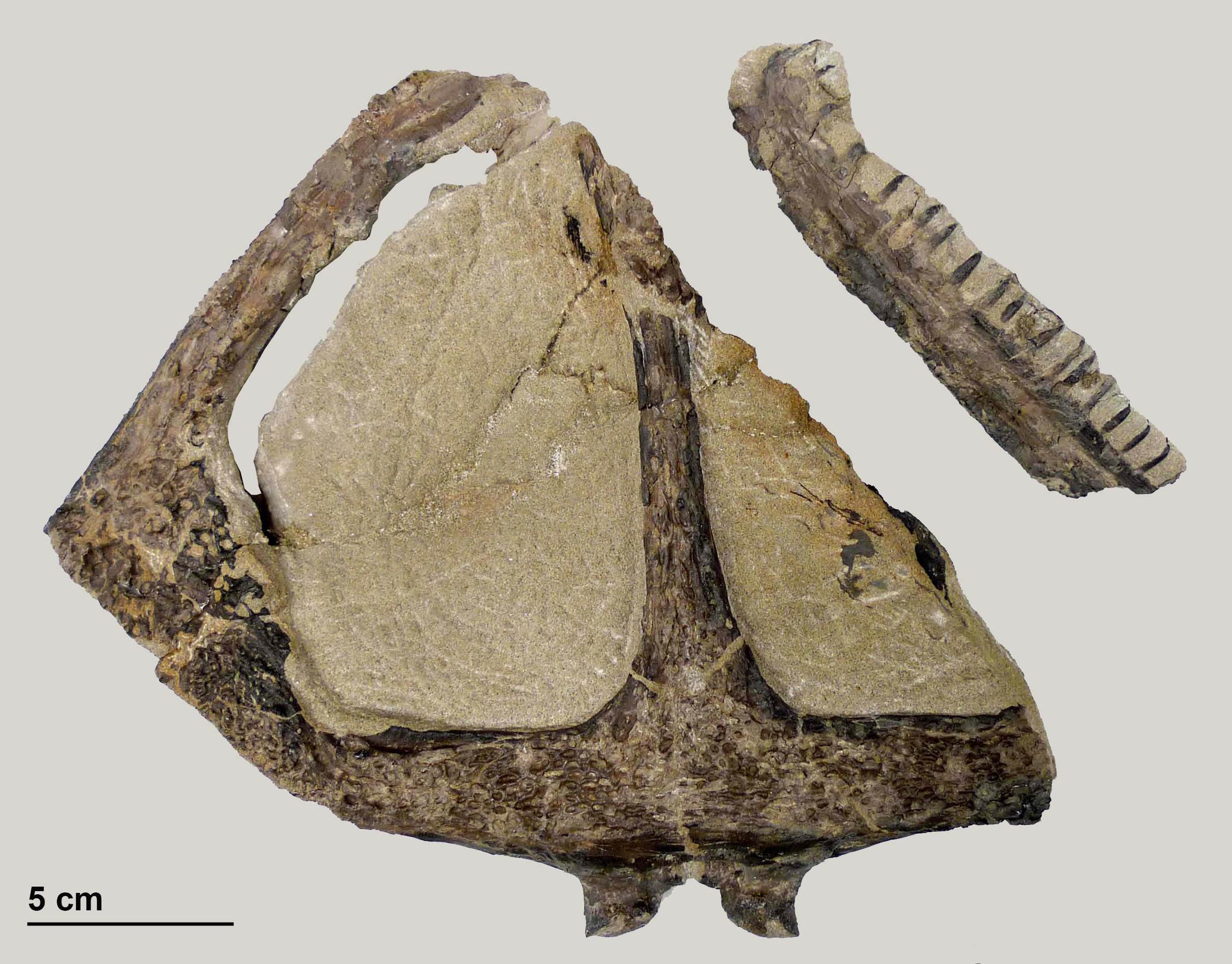 Mastodonsaurus giganteus erreichte an die sechs Meter Länge und gilt damit als das größte Amphibium, das jemals auf der Erde gelebt hat. Sein bis meterlanger, krokodilähnlicher Schädel mit riesigen Fangzähnen weist ihn als Top-Beutegreifer in den Lettenkeupersümpfen aus. Der abgebildete Schädel mit Unterkiefer ist über 60 cm lang.