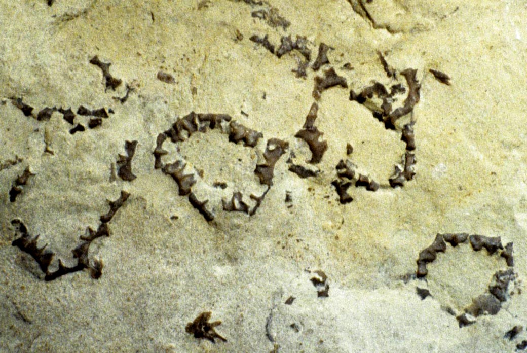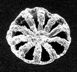 Die winzigen Slerite aus der Holothurien-Haut werden mit mikropaläontologischen Methoden aus Gesteinsproben herausgelöst. Sie sind nützliche biostratigraphische Indikatoren. Das Bild zeigt einen radförmigen Sklerit der Formgattung Jumaraina (früher: Theelia), der basalen Unteren Muschelkalk anzeigt.