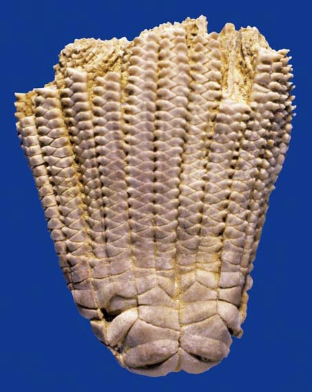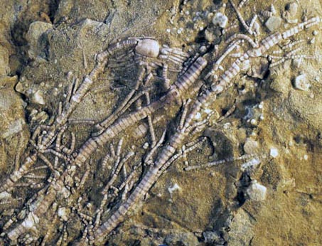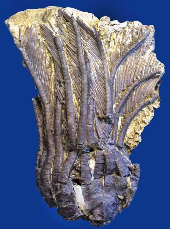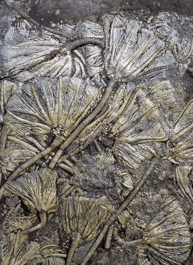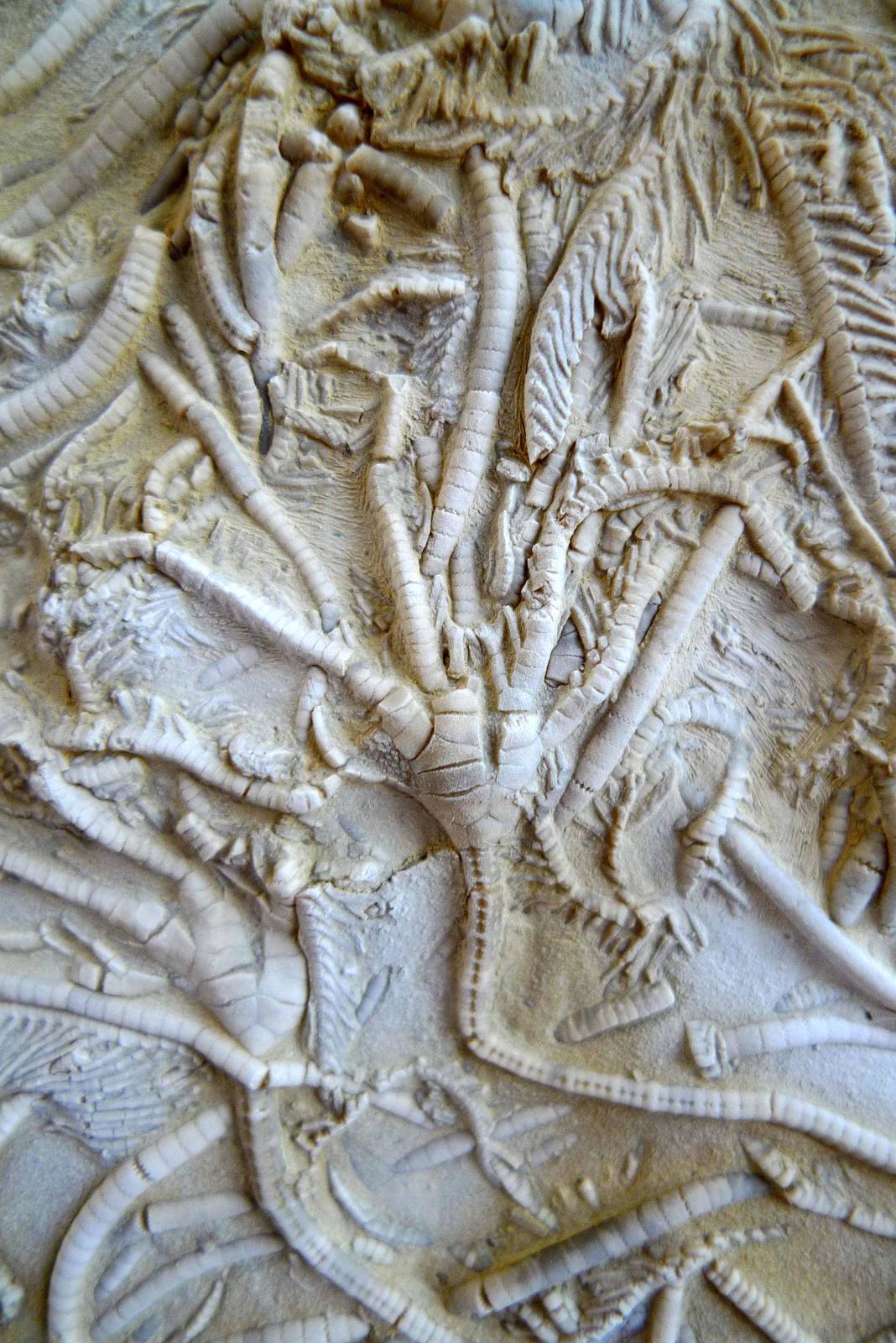 Traumatocrinus aus Schwarzschiefern Süd-Chinas ist ein vielarmiger Abkömmling der Encriniden, der weltweit in der Tethys lebte, allerdings nicht am Boden wie seine Vorfahren. Seine Larven setzten sich an Treibholzstämmen fest, auf denen die Tiere mit Meeresströmungen trifteten. Dabei wuchsen ihre Stiele bis über 15 Meter Länge heran. Das Muschelkalkmuseum hält eine gut sortierte Sammlung dieser Seelilien.