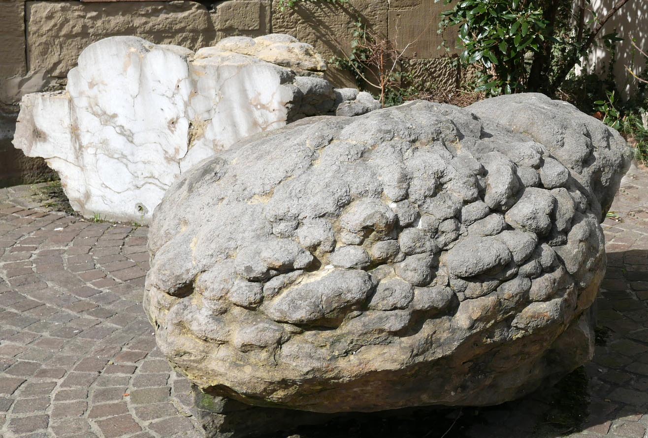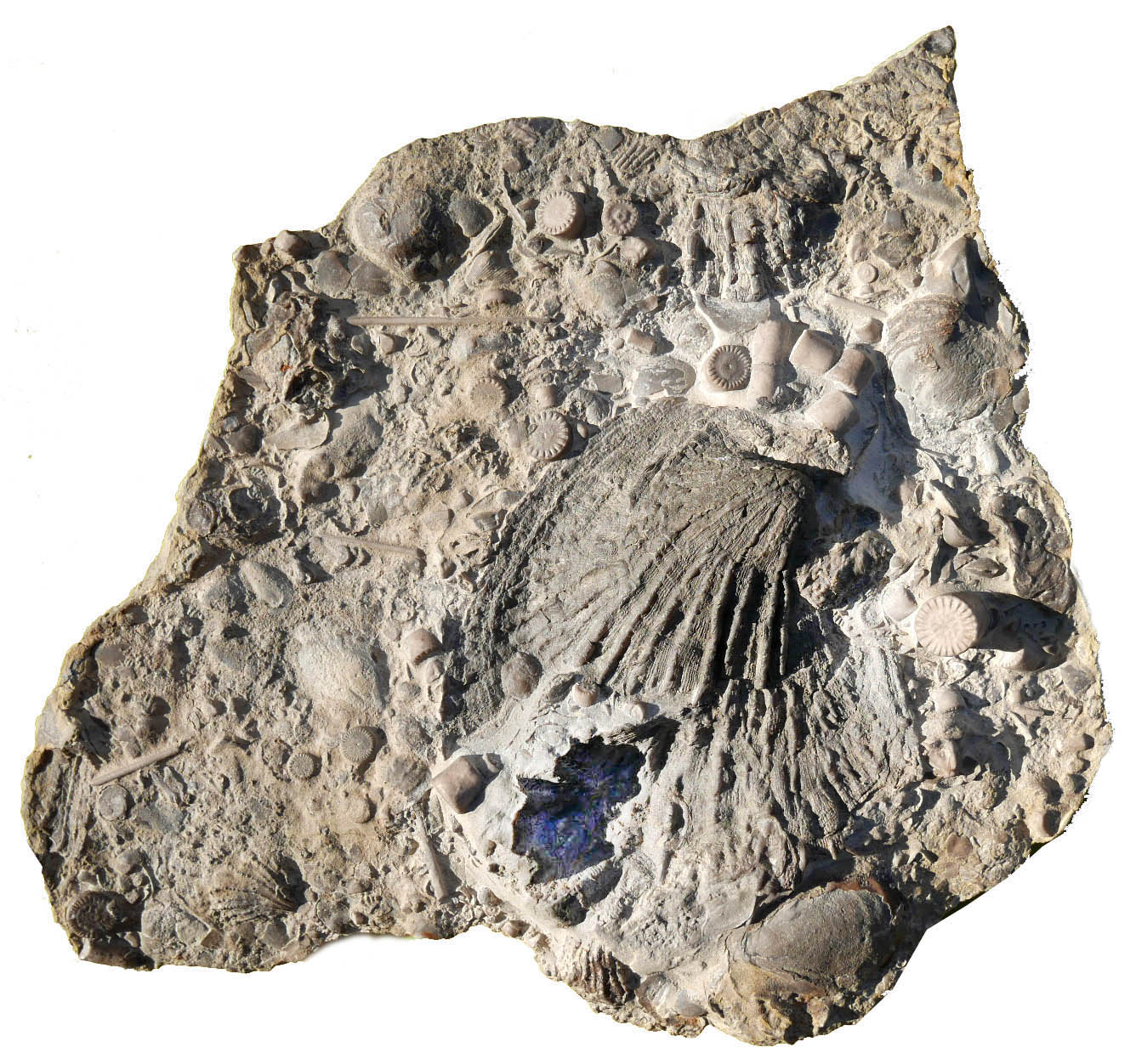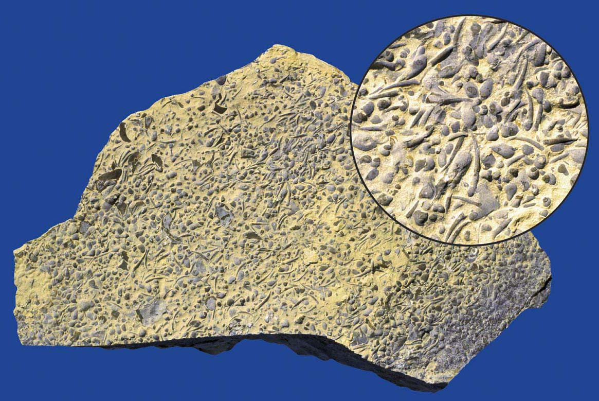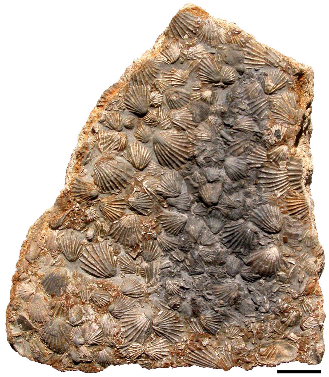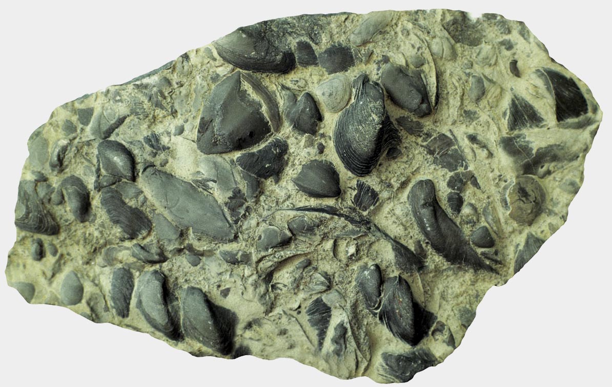 Wo infolge von bodenberührenden Stürmen flach im Sediment grabende Muscheln erodiert wurden, sammelten sich ihre Klappen und wurden von der Strömung so in die stabile Lage eingekippt, dass die Wölbung nach oben zeigt. Längliche Körper wie die Dentalien-Röhren wurden eingesteuert. Solche Vorkommen bezeichnet man als Muschelpflaster.