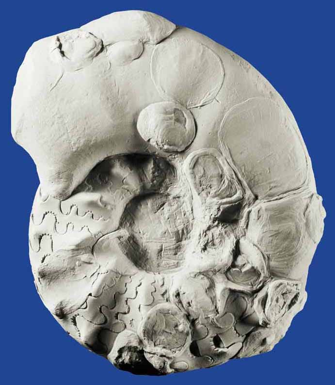 Larven der kleinen austernarigen Muschel Placunopsis siedelten sich auf allerhand festem Untergrund an, z. B. auf Ceratitenschalen. Nach dem Tod einer Muschel fiel die freie Klappe ab und die festgewachsene verblieb auf ihrer Unterlage. Auf diese Weise entstanden im Oberen Muschelkalk kleine Riffstotzen aus tausenden von Placunopsis-Muscheln. Hier wurde ein Ceratites robustus von den kleinen Austern überkrustet.