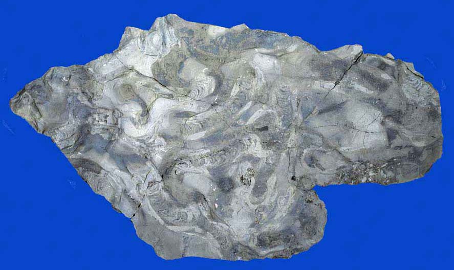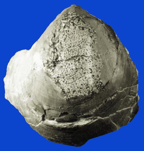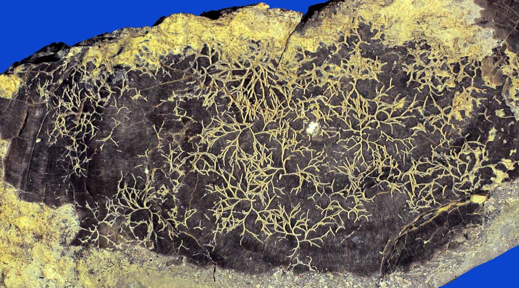 Sog. Hufeisenwürmer (Phoronoida), entfernte Verwandte der Brachiopoden, haben in der aragonitischen inneren Schalenschicht der Pilgermuschel Pleuronectites laevigatus ihre verzweigten Gänge gegraben. Diese wurden mit feinem Sediment verfüllt und erscheinen nun nach der Auflösung der Aragonitschicht als natürliche Ausgüsse gut sichtbar vor dem dunklen Hintergund der äußeren, kalzitischen Schalenschicht der Muschel.
