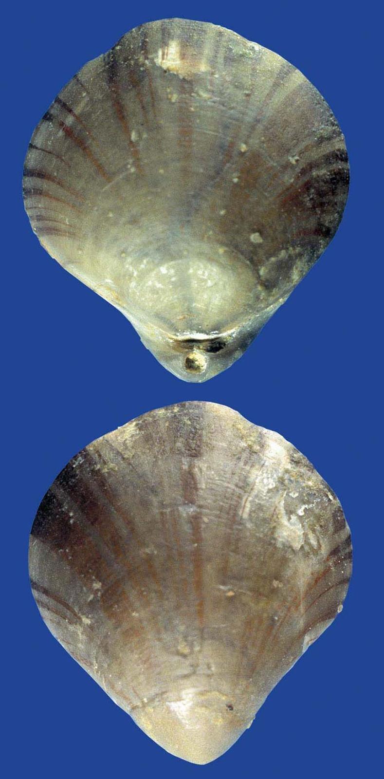 The small posthorn tubes have long been misinterpreted as serpulid worm tubes. Now, their shell mineralogy made clear that they belong to the extinct microconchs, which are distantly related to the brachiopods. Microconchus valvatus with its spiral tubes lived attached to all kinds of shells, here to a terebratulid shell.