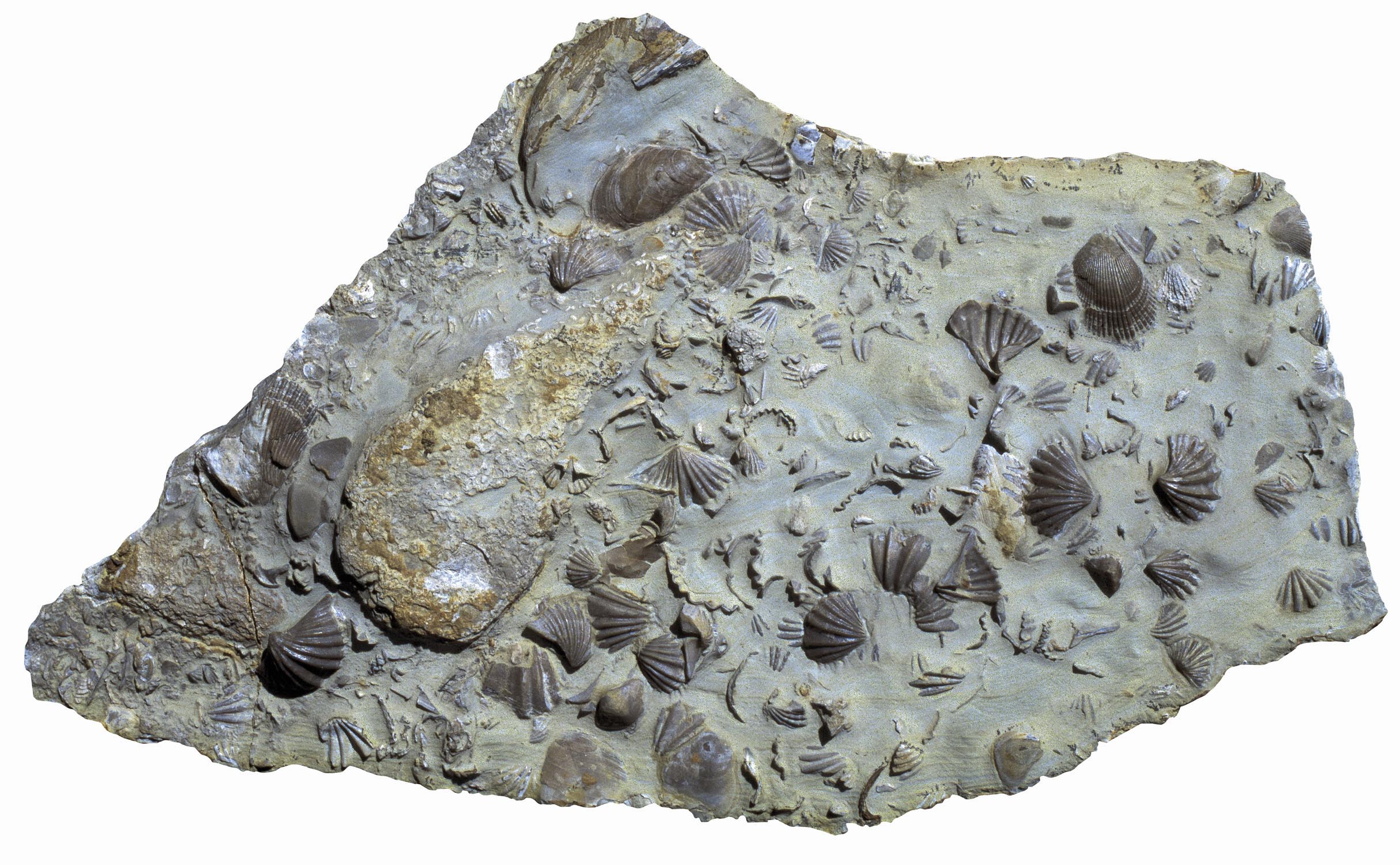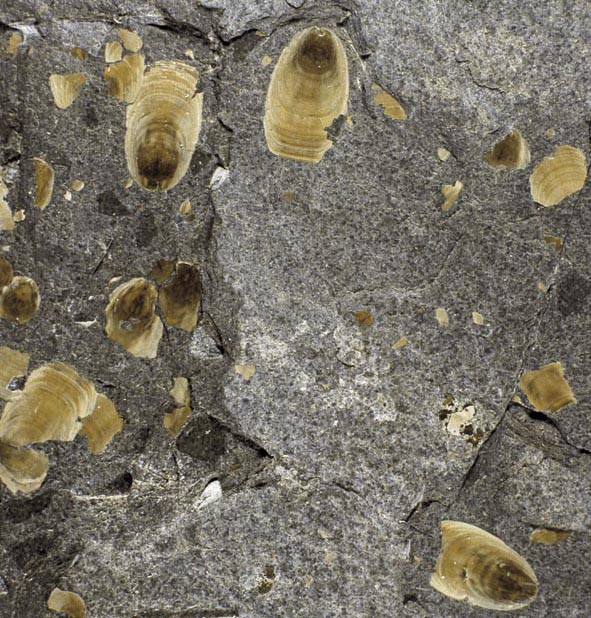 The trivial names are deceiving – their similarity with a Roman oil lamp accounts for the wrong assignment of terebratulid brachiopods to clams and mussels. But brachiopods are no mollusks at all, but bivalved sea creatures with tentacles that belong to a separate phylum. Their ventral and dorsal valves are opened and closed by a complicated system of muscles. Brachiopods without hinges (the former Inarticulata, now Linguliformea) have phosphatic shells and live within muddy seafloors or as epizoans. Brachiopods with hinges (formerly Articulata, now Rhynchonelliformea) have calcitic shells and live attached by a flexible stem. Compared to the Tethyan Triassic the brachiopod diversity of the Muschelkalk is very low. However, the few Muschelkalk species can be extremely abundant in certain shell beds. The small microconch posthorn tubes are distantly related to brachiopods.