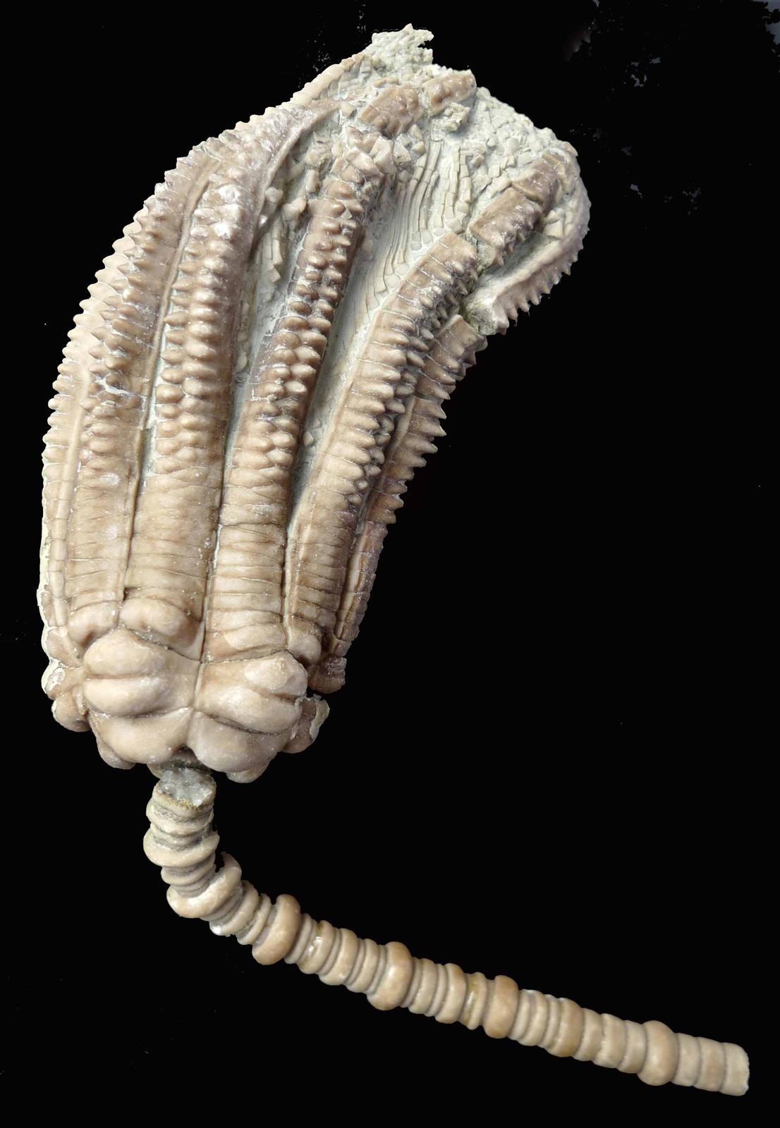 Holocrinus has a pentagonal column with ‘nodal’ columnals, to which five motile cirri were attached that fixed the animal to the seafloor. Holocrinus columnals are frequently found in several Lower Muschelkalk beds, but articulated individuals like those illustrated from Rüdersdorf near Berlin are sought-after rarities. The stub arms on top of the barrel-shaped cup are regenerating after autotomy.