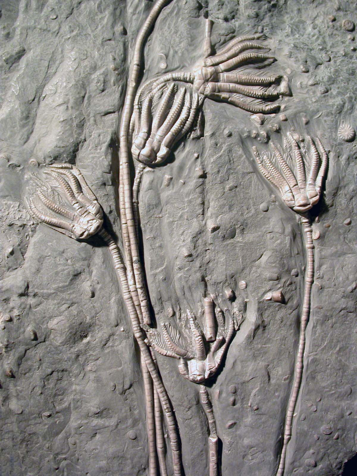 The Muschelkalk Sea was inhabited by additional crinoid genera and species, among which Carnallicrinus and Chelocrinus have 20 arms. The small Dadocrinus is restricted to the eastern parts of the Muschelkalk Sea. Other than the Encrinida, which were permanently attached by holdfasts, appendages of the column called cirri enabled Holocrinus to actively cling to objects, to loose, and to re-attach elsewhere.