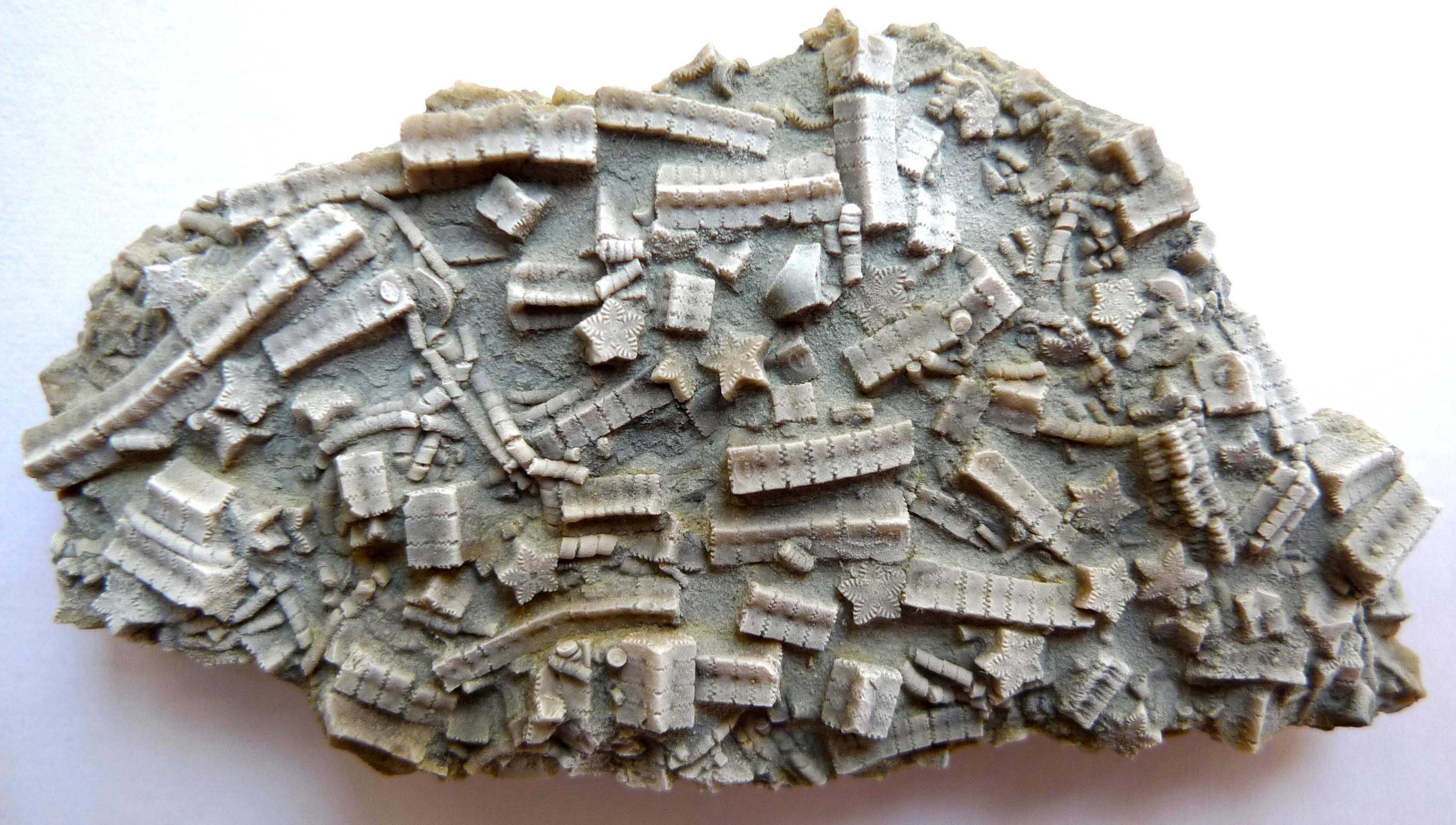 The pentagonal columnals of Holocrinus dubius are concentrated on some Lower Muschelkalk bedding planes. The post-mortal decay of Holocrinus columns into segments of mostly seven columnals followed preformed rupture points. The small elliptical ossicles are cirrals, derived from the disarticulated cirri.